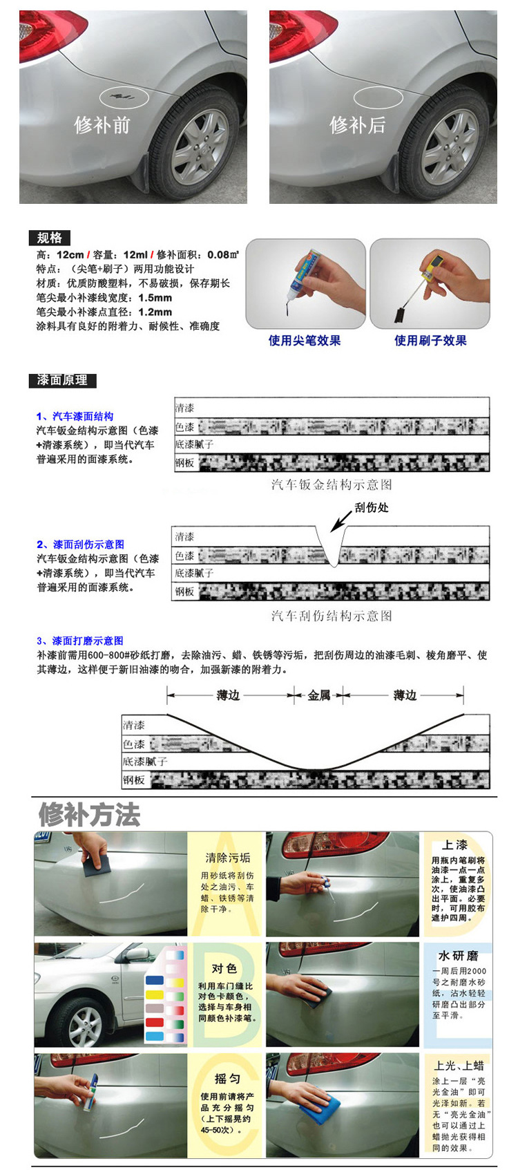 1、輕微劃痕修復(fù):針對(duì)車身上的輕微劃痕,最新補(bǔ)漆技術(shù)可以快速修復(fù),使表面恢復(fù)光滑。