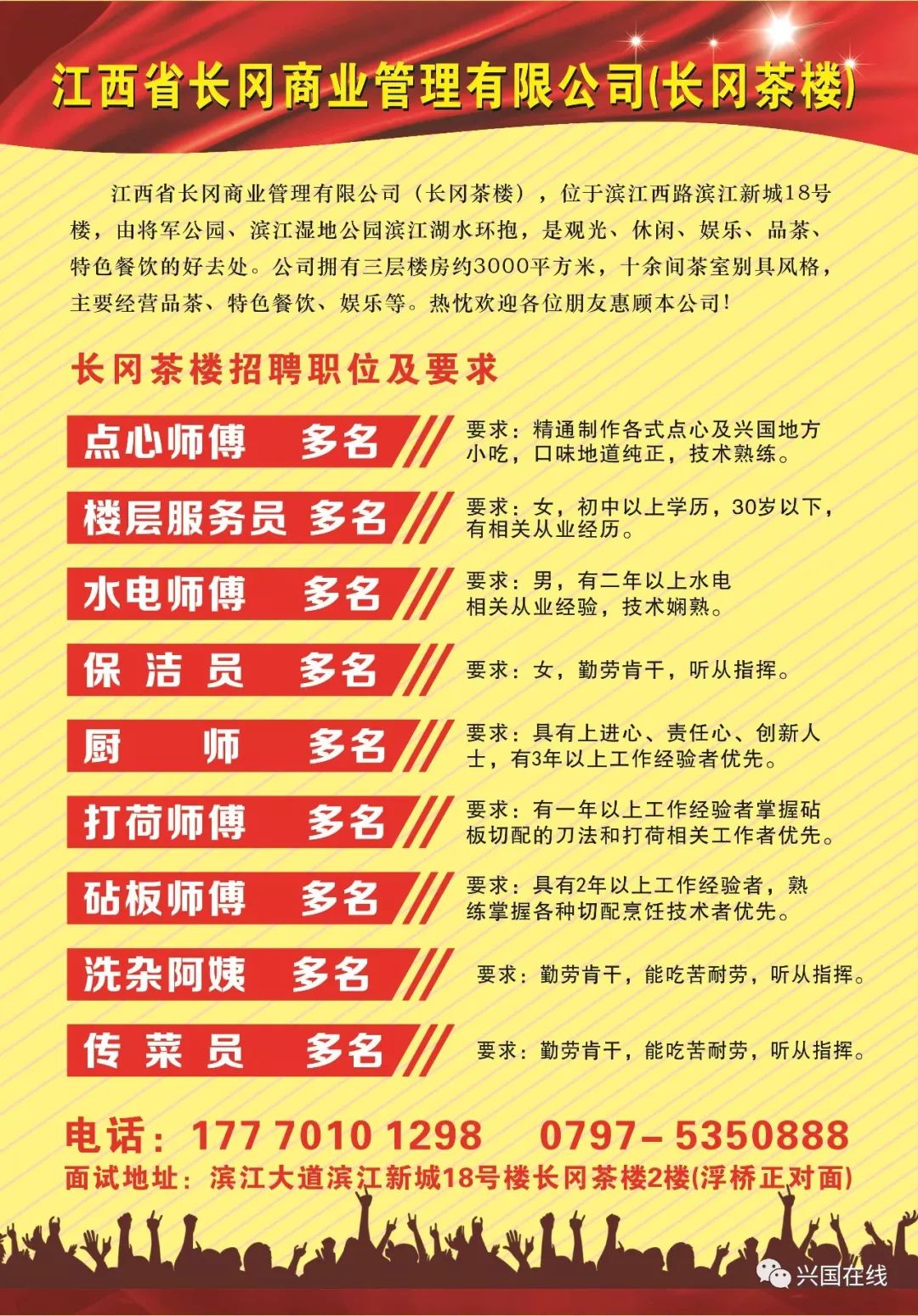 興國(guó)最新招聘活動(dòng)正在進(jìn)行,熱門(mén)職位推薦,涵蓋多個(gè)行業(yè)領(lǐng)域。優(yōu)質(zhì)企業(yè)誠(chéng)邀各類人才加入,無(wú)論你的專業(yè)背景和工作經(jīng)驗(yàn)如何,這里總有一個(gè)適合你的崗位。這是一個(gè)尋找人才、發(fā)掘潛力的絕佳機(jī)會(huì),趕快抓住機(jī)遇,加入我們的企業(yè),共同創(chuàng)造美好未來(lái)!