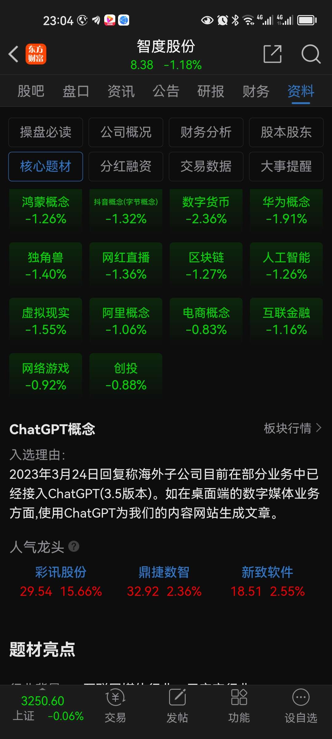 4、使用金融終端軟件,查看智度股份的實時股價、財務(wù)數(shù)據(jù)、研究報告等。