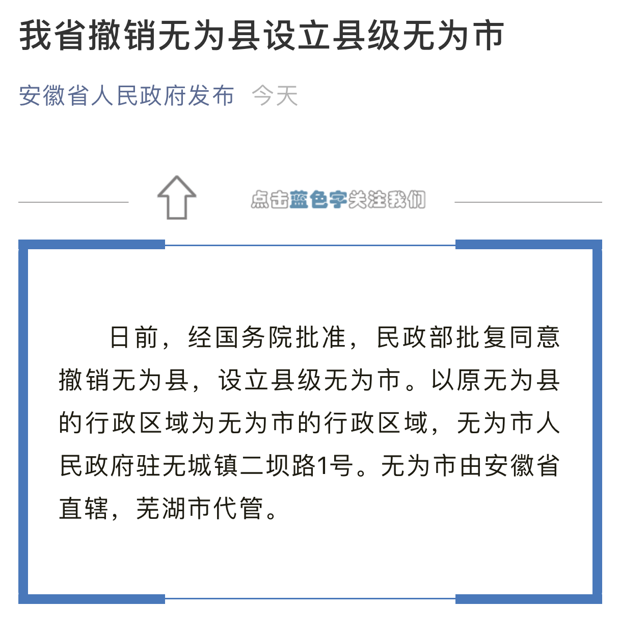 我要和大家分享一則振奮人心的消息——無為縣成功升格為無為市,這一地方行政的升級不僅是時代變遷的見證,更是無數(shù)勤勞人民的努力和智慧的結(jié)晶,這一里程碑事件值得我們共同慶祝,它彰顯了我們的自信與成就感,鼓舞著我們繼續(xù)砥礪前行。